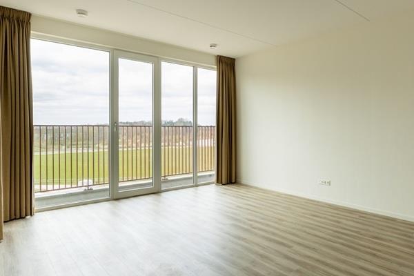 Afgezien van de natte ruimtes, heeft het gehele tussenappartement een mooie, warme PVC-vloer die voorzien is van vloerverwarming. De grote ramen van plafond tot vloer zorgen voor veel natuurlijke lichtinval en een ruimtelijk gevoel. De ramen zijn voorzien van luxe jaloezieën of verduisterende gordijnen. De living met open keuken is ruim opgezet. De moderne keuken met witte kastjes en zwarte stalen handgrepen is uitgerust met RVS Bosch inbouwapparatuur, namelijk een koel-vriescombinatie, inductiekookplaat, vaatwasser en oven-magnetron. Vanuit het woongedeelte is er een deur naar het grote balkon met schitterend vrij uitzicht.