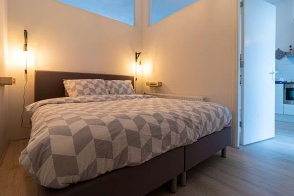 De woonkamer is modern ingericht met aan de straatkant een zithoek met slaapbank, grote stoel, 4K Smart TV en een opbergkast. In het midden van de kamer staat de keuken met nog een opbergkast. Het washok met een wasmachine en een droger bevindt zich tevens in het midden van de woonkamer. Aan de achterzijde van de woning is een eethoek met een hoge tafel + vier stoelen. Via schuifdeur komt men in het buitengedeelte met zithoek. De badkamer en slaapkamer bevinden zich aan de achterzijde van de woning.