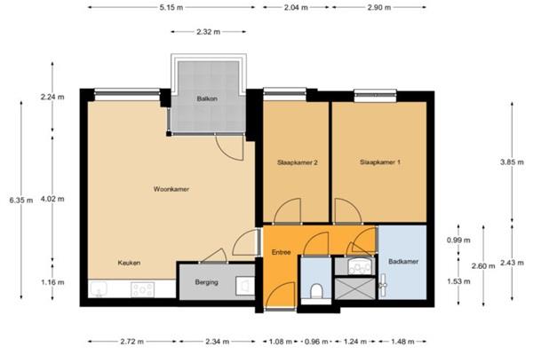 De woning is 61 m2 en is voorzien van een lichte woonkamer met openkeuken, voorzien van inbouwapparatuur. Via de woonkamer heb je toegang tot het ruime balkon. Er zijn twee slaapkamers. De badkamer met inloopdouche en wastafel. Een apart toilet. Daarnaast is er een aparte berging met de plek voor de wasmachine en droger.
