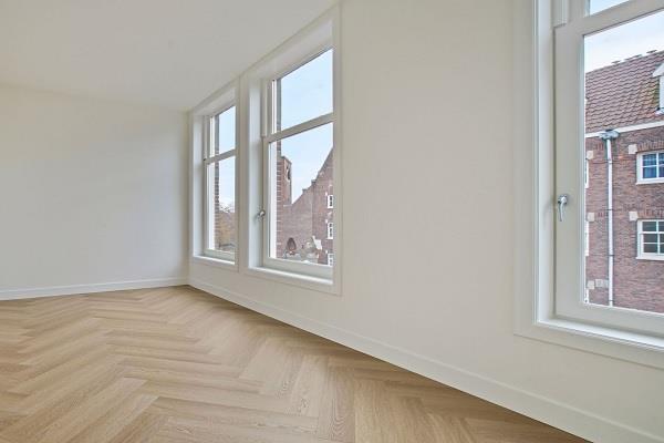 Via de entree op de tweede verdieping betreed je de woning via de centrale hal die toegang biedt tot alle vertrekken. Aan de voorzijde bevindt zich de ruime en lichte woonkamer, met een karakteristieke erker en grote raampartijen. De kamer heeft een open indeling en biedt via dubbele deuren toegang tot het balkon aan de straatzijde. Aangrenzend ligt de keuken, welke is opgesteld in een praktische, langgerekte indeling en beschikt over de benodigde aansluitingen en werkruimte. Aan de rustige achterzijde van het appartement bevinden zich twee ruime slaapkamers. De grootste slaapkamer ligt rechts en biedt voldoende plek voor een groot bed en kastruimte. De tweede slaapkamer ligt links en beschikt over openslaande deuren naar het balkon, met uitzicht op de binnentuinen. De badkamer is centraal gelegen en voorzien van een douche en wastafel. Daarnaast is er een separaat toilet en een CV-ruimte in de hal. Een extra kast biedt plek voor de meterkast en opbergruimte. Kortom: een licht, ruim ingedeeld appartement met twee goede slaapkamers en twee balkons, gelegen op een aantrekkelijke locatie.