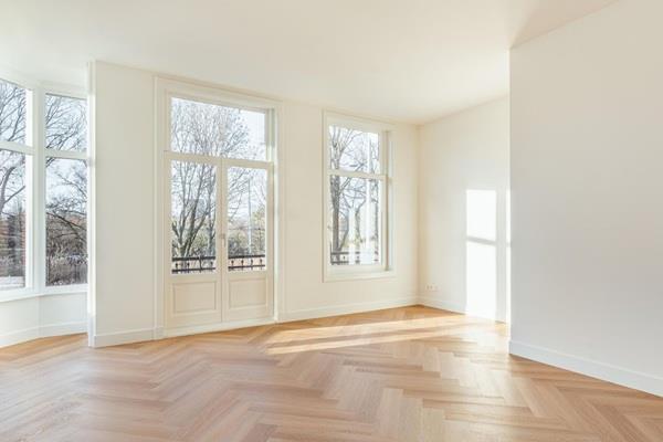 Via de entree op de eerste verdieping betreed je de woning via de centrale hal die toegang biedt tot alle vertrekken. Aan de voorzijde bevindt zich de ruime en lichte woonkamer, met een karakteristieke erker en grote raampartijen. De kamer heeft een open indeling en biedt via dubbele deuren toegang tot het balkon aan de straatzijde. Aangrenzend ligt de keuken, welke is opgesteld in een praktische, langgerekte indeling en beschikt over de benodigde aansluitingen en werkruimte. Aan de rustige achterzijde van het appartement bevinden zich twee ruime slaapkamers. De grootste slaapkamer ligt rechts en biedt voldoende plek voor een groot bed en kastruimte. De tweede slaapkamer ligt links en beschikt over openslaande deuren naar het balkon, met uitzicht op de binnentuinen. De badkamer is centraal gelegen en voorzien van een douche en wastafel. Daarnaast is er een separaat toilet en een CV-ruimte in de hal. Een extra kast biedt plek voor de meterkast en opbergruimte. Kortom: een licht, ruim ingedeeld appartement met twee goede slaapkamers en twee balkons, gelegen op een aantrekkelijke locatie.