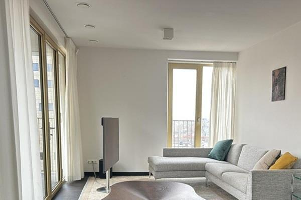 Via de lange hal komt je het appartement binnen. Vanuit de hal bereikt je de slaapkamer (ca. 18 m²) met de ensuite badkamer (ca. 3 m²). Verder ligt de ruime L-vormige woonkamer van ca. 45 m² met grote raampartijen en balkon in de hoek bevindt zich de open keuken met kookeiland, deze is compleet uitgerust en van alle gemakken voorzien.