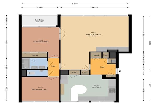 inbouwkast, toegang naar balkon/loggia en rolluik. Badkamer met dubbele wastafel en separaat