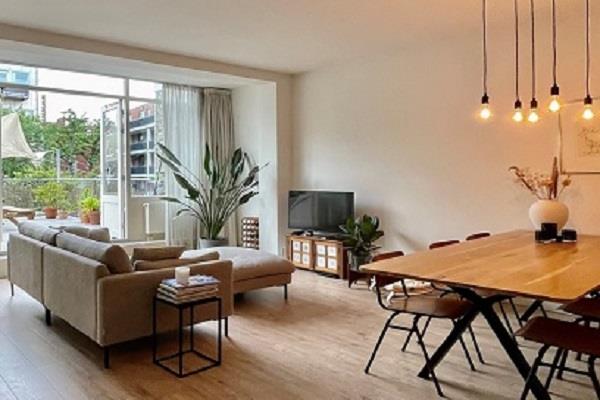 Ruime woonkamer met openslaande deuren naar een ruimterras.