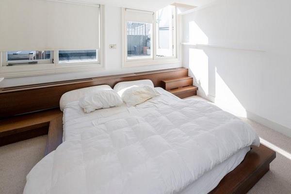 overloop, kast met wasmachine, toilet, ruime slaapkamer met tweepersoonsbed en een open badkamer. De badkamer is voorzien van een ligbad met douche en een wastafel. Aan beide kanten van de slaapkamer is er toegang tot een riant dakterras, ligging op het zuiden.