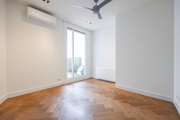 Aan de achterzijde van het appartement bevinden zich de woonkamer en de open keuken. Deze ruimte is zeer licht dankzij de grote ramen die de hele ruimte omringen. Voor extra comfort is het hele appartement voorzien van airconditioning. De keuken is uitgerust met alle moderne apparatuur, zoals een afzuigkap, vaatwasser, grote ingebouwde koel-vriescombinatie en veel opbergruimte.
