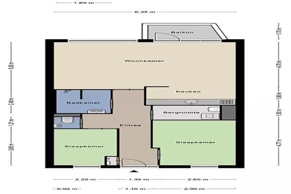 De twee slaapkamers liggen aan de voorzijde van het appartement. De eerste slaapkamer is circa 8 m², de tweede, ruimere slaapkamer is ongeveer 14 m² en biedt extra comfort en flexibiliteit.