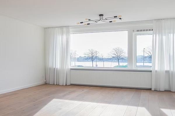 Via de verzorgde entree en het trappenhuis treft u een separaat toilet met fonteintje, waarna toegang tot de fraaie woonkamer en suite, voorzien van een lichte houten vloer en een bio-ethanol open haard, met toegang tot het zonnige balkon op het noorden met uitzicht op de binnentuin. De strakke witte keuken met inbouwapparatuur, waaronder een 4-pits gasoven, combi-oven, vaatwasser en afzuigkap, biedt voldoende opbergruimte. Het raam in de woonkamer aan de zuidzijde is eveneens voorzien van een elektrisch verstelbare zonnewering.