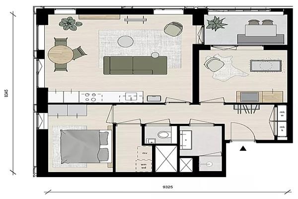 De woonkamer voelt ruim en open, met grote ramen die het daglicht volop binnenlaten. De open keuken sluit hier moeiteloos op aan en vormt het gezellige middelpunt van de woning – een fijne plek om iets snel te bereiden of juist uitgebreid te koken tijdens een ontspannen avond.
