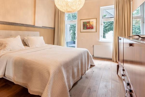 De hoofdslaapkamer bevindt zich aan de achterzijde van het gebouw en geeft toegang tot de privétuin met terras.