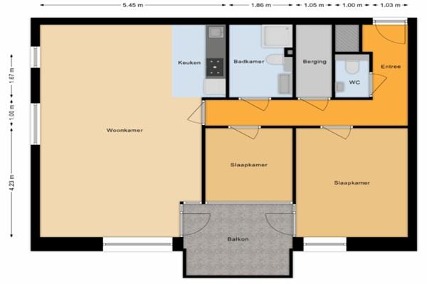 De woning, van 85 m2, kom je binnen via de hal met toegang tot alle vertrekken. De ruime woonkamer met open keuken is licht en biedt toegang tot het balkon. De keuken is voorzien van inbouwapparatuur. Er zijn twee goed formaat slaapkamers. De badkamer met douche, wastafel en toilet. Daarnaast is er ook een apart toilet. In de berging is plek voor de wasmachine en droger.