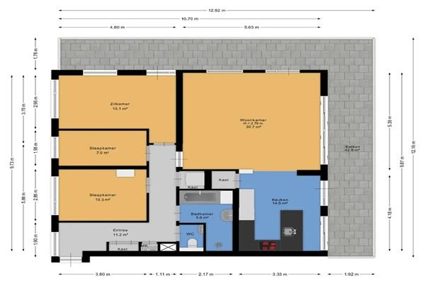 De royale woonkamer heeft een speelse indeling en hoge ramen met meerdere balkondeuren en een dubbele schuifpui. Zodra je deze opent, lopen de woonkamer en het grote, zeer zonnig gelegen en overdekte terras (42 m²) naadloos in elkaar over – perfect voor lange zomeravonden en etentjes buiten. De moderne, halfopen woonkeuken met alle inbouwapparatuur biedt volop werk- en bergruimte en grenst aan een handige (provisie)bergkast.