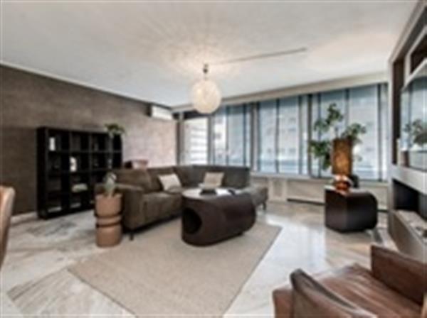 Ruime en lichte woon- en eetkamer (over de volledige breedte van het appartement) met marmeren vloer, gashaard en toegang tot het balkon. Grote ramen zorgen voor aangenaam natuurlijk licht.