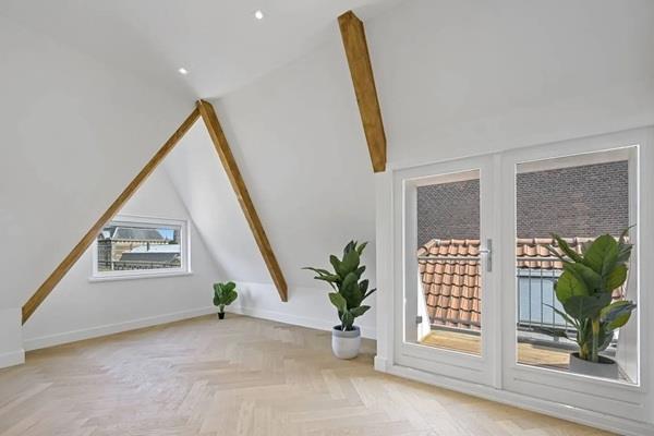Indeling: Via de gezamenlijke entree op straatniveau kom je in het trappenhuis welke zojuist volledig is gerenoveerd. De entree van de woning is op de 2e etage waarna een trap je naar naar de top etage brengt. De woonkamer is licht en ruim en heeft een open woonkeuken voorzien van luxe apparatuur zoals twee ovens, inductiekookplaat, vaatwasser en koel- vriescombinatie. Via openslaande deuren heb je toegang tot het balkon gelegen op het zuidoosten met ochtend- en middagzon. In de gang is het toilet met fontein. De hoofdslaapkamer is gelegen aan de achterzijde. De tweede slaapkamer is gelegen tussen de hoofdslaapkamer en de keuken. De badkamer is ruim en luxe, en voorzien van ligbad, inloopdouche, wastafelmeubel en handdoek radiator. Door de gehele woning ligt een prachtige houten visgraat vloer met vloerverwarming.