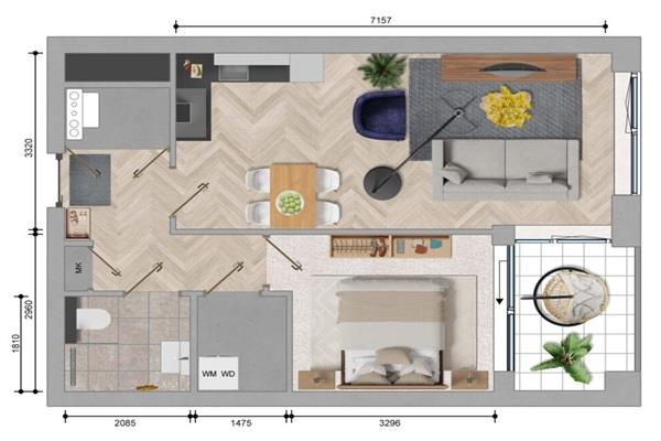 Het appartement beschikt over een goed formaat slaapkamer. De badkamer is modern afgewerkt en voorzien van een inloopdouche, wastafelmeubel en toilet. Daarnaast is er een aparte berging met aansluitingen voor een wasmachine en droger.