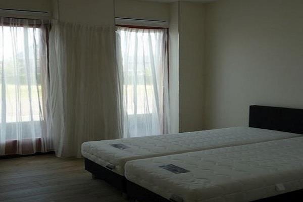 Via de gang tevens toegang tot de masterbedroom met een 2-persoonsbed (inclusief matras, nachtkastje en garderobekast. De tweede slaapkamer is ingericht met een stapelbed met matrassen en een garderobekast. De geheel betegelde badkamer is voorzien van een wastafel met fantastische design spiegel, ligbad en separate grote inloopdouche. Separaat -eveneens geheel betegeld toilet- met fonteintje en inpandige berging waar wasmachine en droger staan opgesteld. Externe berging is eveneens aanwezig.