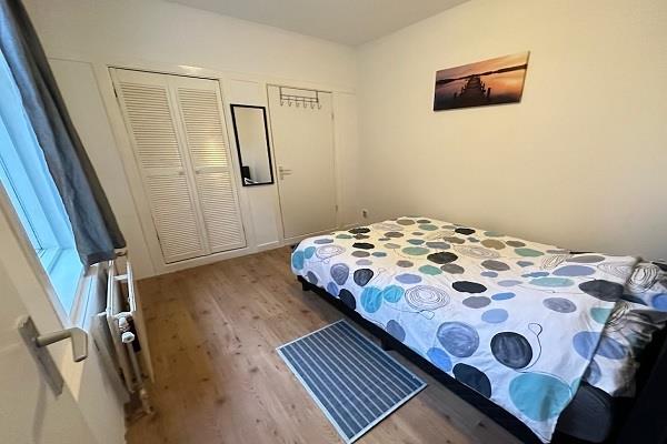 De slaapkamer is voorzien van een tweepersoonsbed en een inbouwkast.