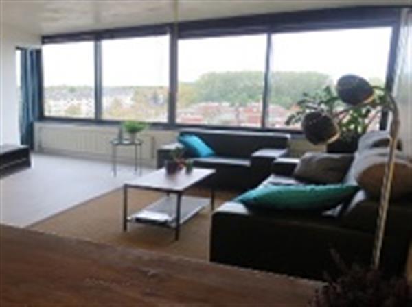 Via de entreehal op de 6e verdieping, zijn alle vertrekken in het appartement te bereiken. Men komt binnen in de woonkamer en direct vallen de grote ramen op. Hierdoor komt er veel natuurlijk licht de woning binnen en is het hier heerlijk vertoeven. De woonkamer is netjes afgewerkt met een nieuwe laminaatvloer en ingericht met een eetkamertafel en luxe bankstel. Via de woonkamer stapt men het balkon op.