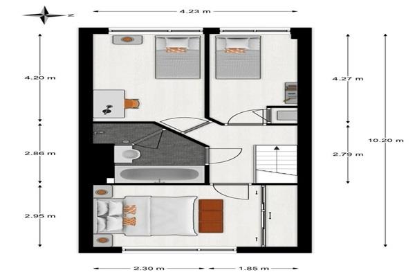 Overloop, 3 slaapkamers en een ruime moderne badkamer. De badkamer is voorzien van een bad, douche en wastafel met meubel.