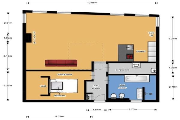 De tweede slaapkamer is open ingedeeld in de woonkamer en kan gebruikt worden als kantoor aan huis of logeerkamer.