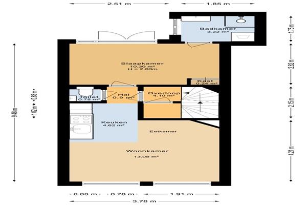 Via de trap in de hal bereik je de bovenste verdieping. Hier vind je opnieuw een gezellige woonkamer met een open keukentje, een badkamer met douche en toilet, en een slaapkamer aan de achterzijde. Dankzij deze slimme indeling kunnen beide verdiepingen als zelfstandige woonruimtes functioneren – perfect voor twee bewoners die samen willen wonen maar toch hun eigen plek willen behouden.