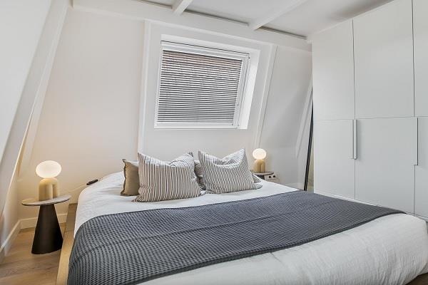 De slaapkamer biedt een comfortabel tweepersoonsbed en heeft een royale kastenwand voor voldoende opbergruimte. De aangrenzende badkamer is modern ingericht met een inloopdouche, dubbele wastafel, wc en een handige was-/droogcombinatie.