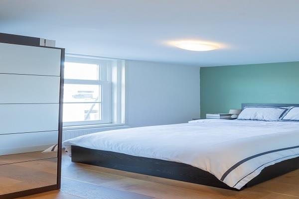 De woonkamer met open keuken bevindt zich aan de voorzijde van de woning, terwijl de slaapkamers aan de achterzijde liggen. De bovenverdieping van de maisonette biedt een extra kamer en directe toegang tot het ruime dakterras.