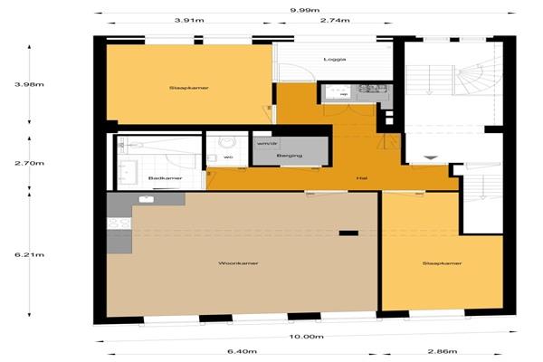 Ruime hal met toegang tot alle vertrekken. De lichte woon-/eetkamer met open keuken is van goed formaat en biedt een fraai uitzicht op de winkelstraat. De nieuwe keuken is uitgerust met een inductiekookplaat, combi oven/magnetron, koelkast met vriesvak en vaatwasser.