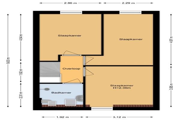 2e verdieping: overloop, slaapkamer voorzijde met dakkapel, twee slaapkamers aan de achterzijde, moderne badkamer met douchecabine, wastafelmeubel met spiegel, zwevend toilet en handdoekradiator.