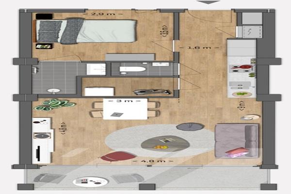 Binnenkomst in de gang van waaruit de slaapkamer, het toilet, technische ruimte en woonkamer, bereikbaar zijn. De badkamer is via de slaapkamer te bereiken.