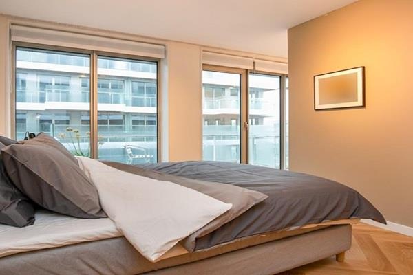 De open woonkamer heeft veel natuurlijk daglicht dankzij de kamerhoge ramen en toegangsdeuren naar het balkon. Al het kwaliteitsmeubilair is zorgvuldig geselecteerd en geeft het appartement een warm, luxueus gevoel.