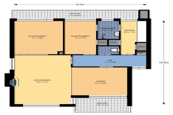 Indeling appartement: entree, hal met meterkast, toilet met fontein, woonkamer met zijkamer, 2 slaapkamers keuken met toegang tot doucheruimte, maar liefst twee balkons; één aan de voorkant en één aan de achterzijde. Het appartement heeft een inpandige fietsenberging.