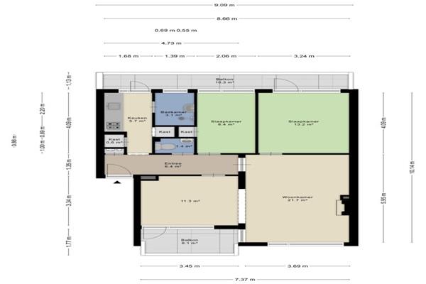 Indeling appartement: entree, hal met meterkast, toilet met fontein, woonkamer met zijkamer, 2 slaapkamers keuken met toegang tot doucheruimte, maar liefst twee balkons; één aan de voorkant en één aan de achterzijde. Het appartement heeft een inpandige fietsenberging.