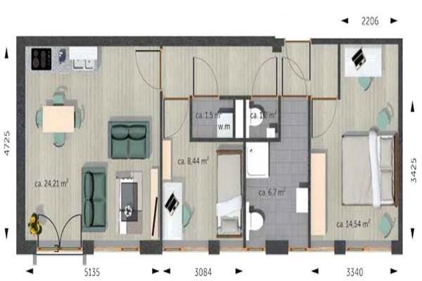 Indeling: entree, gang met toegang naar een slaapkamer, de badkamer, separate toilet, berging waar de wasmachine aansluiting zich bevindt, tweede slaapkamer en de ruime woonkamer met keuken. De woonkamer heeft twee openslaande deuren met frans balkon, waardoor u kunt genieten van zonnestralen en de buitenlucht in uw woonkamer. De keuken is voorzien van elektrische kookplaat, afzuigkap, koelkast met vriesvak en combimagnetron. De badkamer heeft een inloopdouche en tweede toilet.