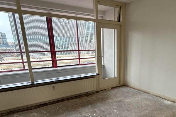 Indeling; gemeenschappelijke entree met toegang tot berging, trappenhuis en lift. Entree appartement, eenvoudig keukenblok met handige inbouwkast. Aparte berg/ wasruimte met aansluiting voor wasmachine en droger. Separaat toilet met fontein. Badkamer voorzien van douche en wastafel. Riante woonkamer met handige inbouwkast en een spectaculair uitzicht over het Centraal station. Hier is het heerlijk zitten. Vanuit de woonkamer heeft u toegang tot het inpandig balkon waarvan de raampartijen volledig open kunnen. Aansluitend bevinden zich aan de voorzijde van het appartement twee goede slaapkamers en naast de woonkamer een 3e slaapkamer.