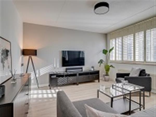 De ruime woonkamer (ca. 34 m²) heeft grote ramen die zorgen voor veel lichtinval en zijn voorzien van stijlvolle shutters. Vanuit de woonkamer is het balkon van ca. 8 m² bereikbaar, gelegen op het noorden, met rookglas panelen en uitzicht op het stationsplein.
