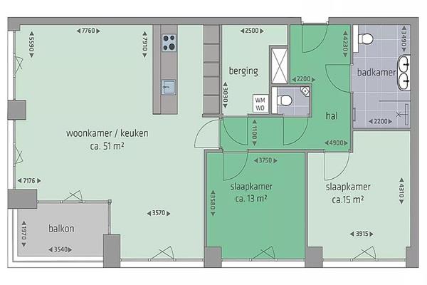 Het appartement beschikt over een lichte woonkamer met toegang tot het balkon. Het appartement heeft 2 slaapkamers. De keuken is uitgerust met diverse inbouwapparatuur. De badkamer is luxueus uitgevoerd met een douche en dubbele wastafel. Tevens tref je een aparte berging in het appartement welke is voorzien van een aansluiting voor jouw wasmachine en/of droger.