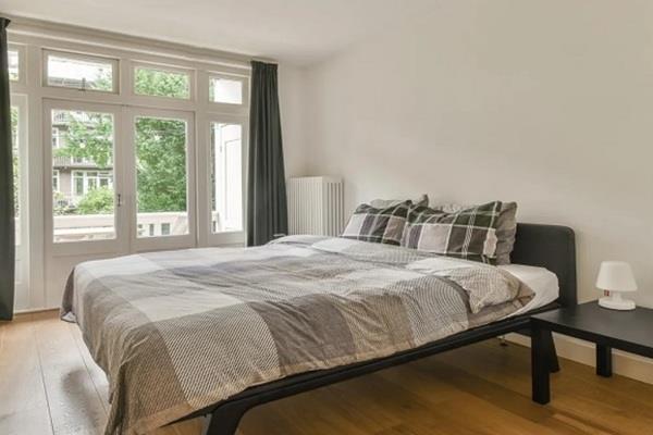 Aan de voorzijde bevindt zich de lichte en ruime woonkamer. De openslaande deuren naar het Franse balkon bieden uitzicht op het groene plantsoen; samen met de erker, het glas-in-lood en de zuidligging zorgt dit voor een warme, sfeervolle ruimte met veel natuurlijke lichtinval.