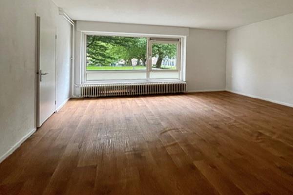 De lichte woonkamer is gelegen aan de voorzijde van het appartement.