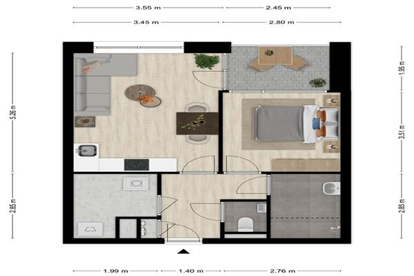 De appartementen beschikken over een strak afgewerkte keuken met inbouwapparatuur, waaronder een inductiekookplaat, combimagnetron, koelkast met vriesvak, vaatwasser en afzuigkap. Het donkere composiet werkblad geeft de keuken een moderne uitstraling. De badkamer is netjes en eigentijds ingericht met antracietkleurige vloertegels, een wastafel met spiegel en een comfortabele douche. En is er een separate toilet aanwezig.