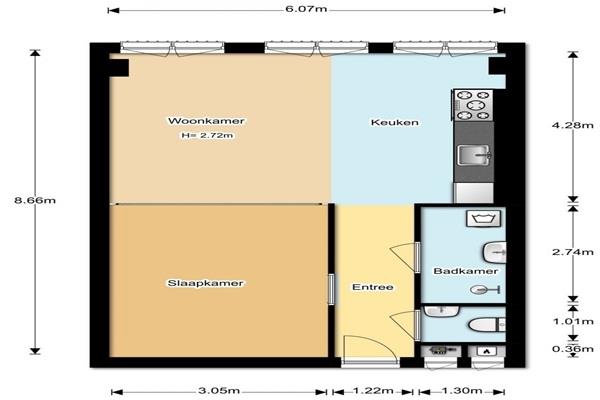 2e verdieping; zeer nette entree/hal met aansluitend de woonkamer met open keuken, aansluitend aan de hal de entree naar het ruime slaapgedeelte (met prachtige glazen wand!). Tevens is er vanuit de hal directe toegang tot de badkamer en het aparte toilet.