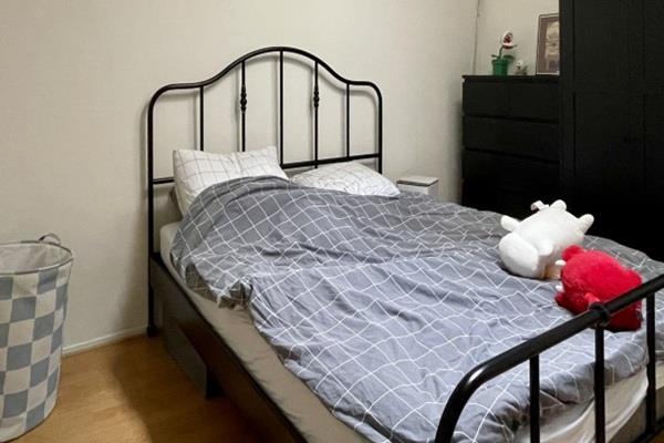 Woonkamer met open keuken, ruime slaapkamer en badkamer.