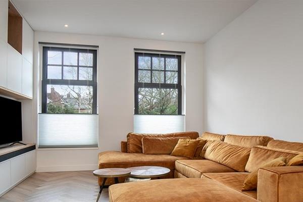 De statige entree met origineel glas-in-lood ramen leidt u naar de voordeur en hal. Hier treft het luxe toilet met fonteintje. De royale, doorzon woonkamer is voorzien van een fraaie visgraat pvc-vloer en hoge plafonds met inbouwverlichting. Ook de keuken is luxe en voorzien van een inductie kookplaat, vaatwasser, koel-/vriescombinatie en een combi-/magnetron. De ruime kantoor-/slaapkamer biedt toegang tot de zonnige achtertuin op het zuidwesten en is voorzien van een inpandige bergruimte.