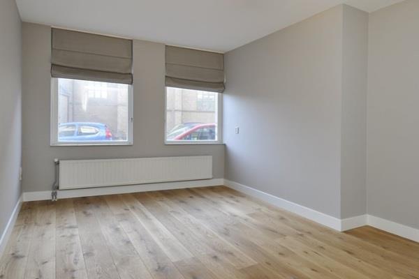 Op de eerste etage een overloop met modern, vrijhangend toilet. Heerlijk lichte woonkamer over de volledige lengte van het appartement met Frans balkon, fraaie houten planken vloer en vrij uitzicht op kerk.