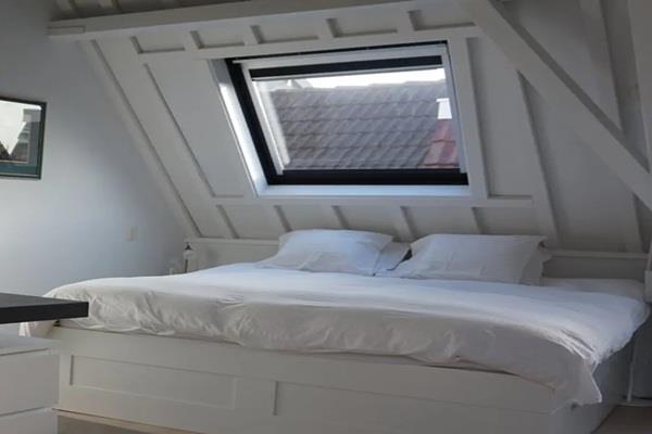 De vaste trap geeft toegang tot de ruime slaapkamer en de badkamer van het appartement. Ook hier zijn de balken in het zicht gelaten en ademt de sfeer je tegemoet. Er is gekozen voor luxe sanitair en een perfecte afwerking van het geheel.