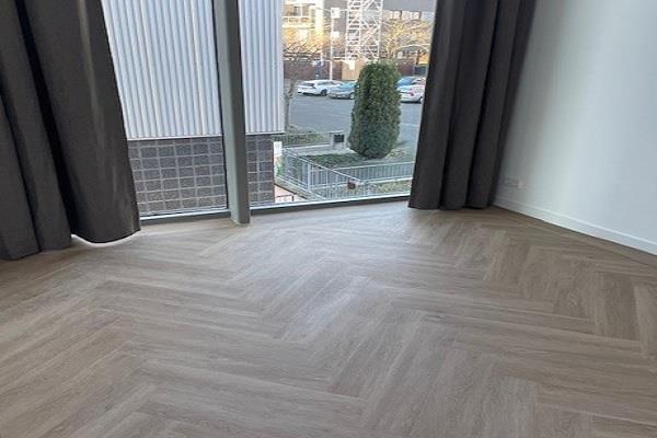 Zeer ruime woonkamer met uiterst duurzame PVC vloer, gelegd in visgraat motief en luxe raamafwerking. Deze woning is met hoogwaardige materialen afgewerkt.