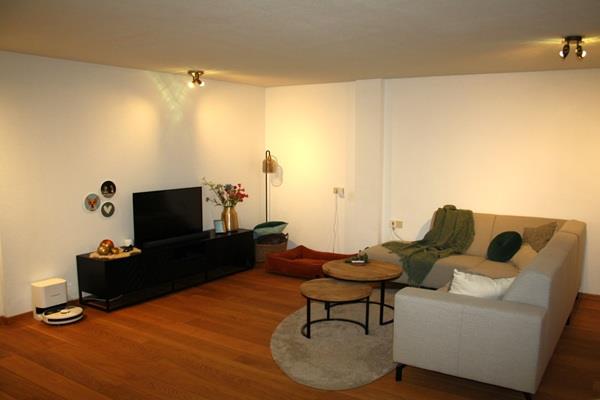 Hal/entree (2.35 x 2.43). Ruime L-vormige woonkamer (6.10 x 5.50 + 2.37 x 4.07) totaal circa 43m2. Hal naar gesloten leefkeuken (5.00 x 4.29). De keuken is voorzien van een tegelvloer en een ruime hoekkeuken met apparatuur (koelkast, oven, keramische kookplaat afzuigkap, vaatwasser). Bijkeuken ( 1.33 x 3.54) met wasmachineaansluiting. Betegeld toilet met fonteintje. Geheel betegelde badkamer (circa 6.5m2) met bergkast, ligbad, wastafel en douche met douchecabine.