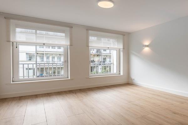De ruime en lichte woonkamer is voorzien van een Frans balkon met uitzicht op de pittoreske Wilhelminastraat en sluit naadloos aan op de open keuken.
