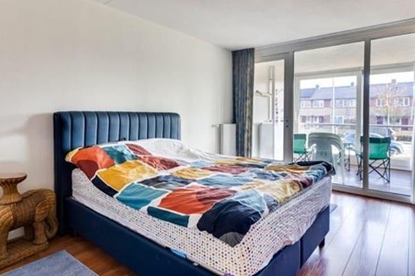 De hoofdslaapkamer is ruim, met laminaatvloer en directe toegang tot de loggia.
