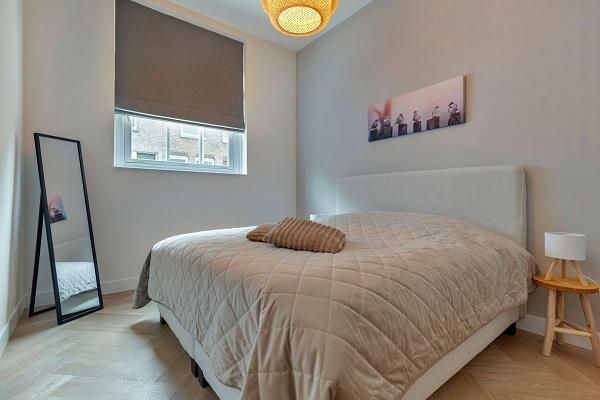 De ruime slaapkamer aan de voorzijde van het appartement is voorzien van een comfortabel tweepersoonsbed. Vanuit de slaapkamer bereikt u de moderne badkamer, die is uitgerust met een inloopdouche en een stijlvol wastafelmeubel.